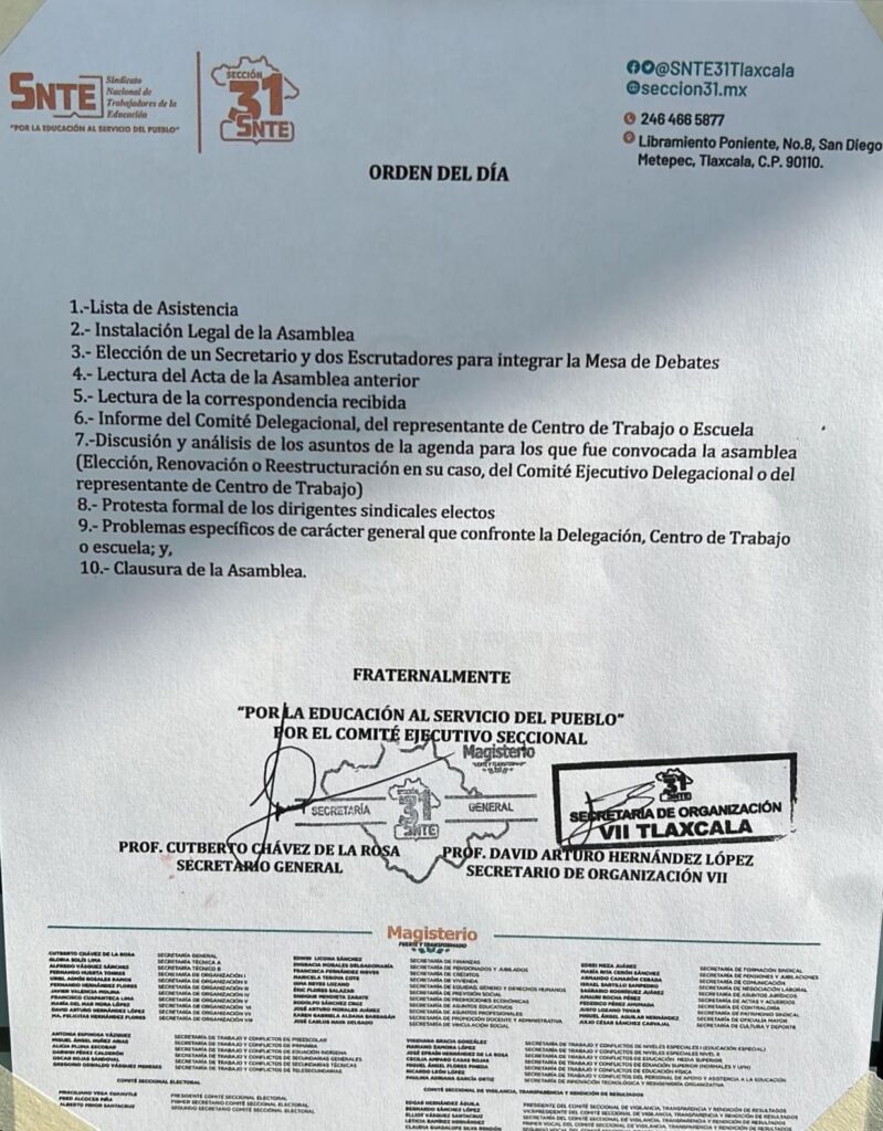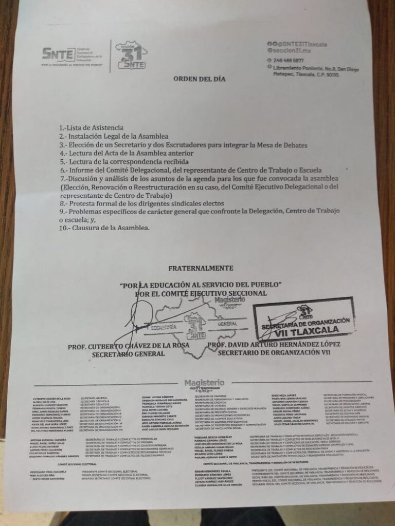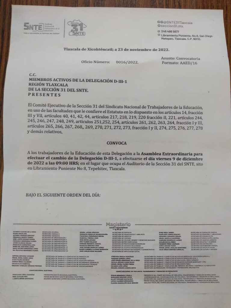 Y es que la víspera el Comité Ejecutivo de la Sección 31 del Sindicato Nacional de Trabajadores de la Educación (SNTE) que encabeza Cutberto Chávez de la Rosa y la Delegación Sindical D-III-1 mediante oficio con fecha 23 de Noviembre -que incluye Orden del Día- en base al estatuto convocaron a los agremiados adscritos al complejo administrativo SEPE-USET, a asistir a la Asamblea programada a desahogarse el próximo 9 de Diciembre a partir de las 09:00 horas en el auditorio de la Sección 31 del SNTE en Metepec de la capital y participar en el Proceso de Renovación o Reestructuración Delegacional.