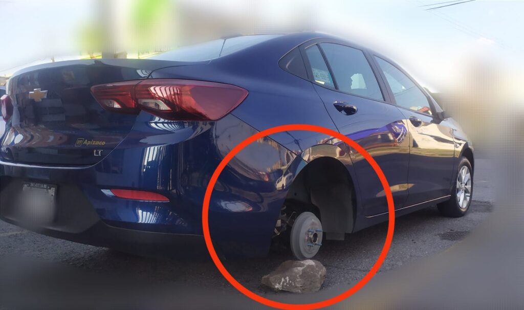 Al rayar el sol matinal, cuando el hoy afectado se disponía a iniciar sus labores detectó que a su Chevrolet Onix de color azul y placas de circulación locales (estacionado en el entronque de Jardín de los Cedros y Privada Felipe Lardizabal) le faltaban las llantas y los rines delantera izquierda y trasera derecha; situación de inesperado que invariablemente lo afectó, pero indignó más el que los perpetradores arrancaran el espejo lateral derecho.