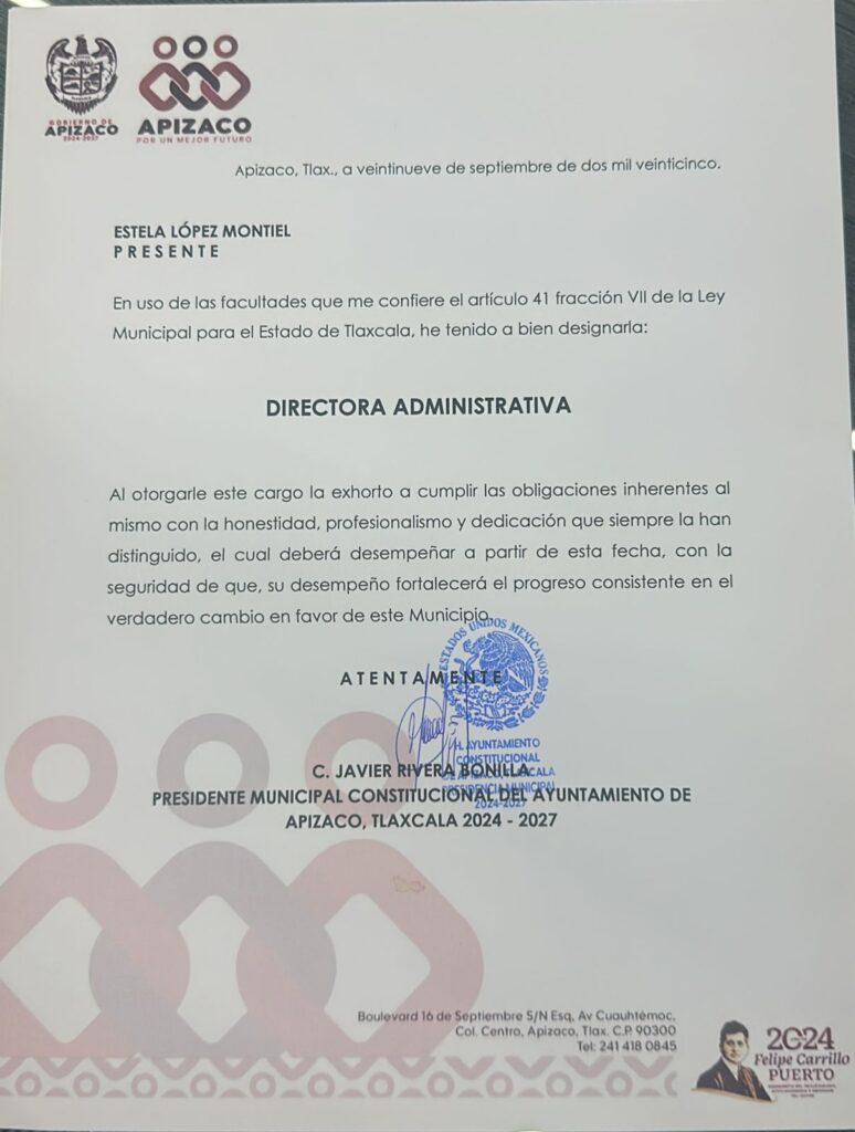 El presidente municipal de Apizaco, Javier Rivera Bonilla, designó a Estela López Montiel como Directora Administrativa del Ayuntamiento de Apizaco, quien cuenta con la capacidad y el compromiso para contribuir al buen funcionamiento de la administración pública.